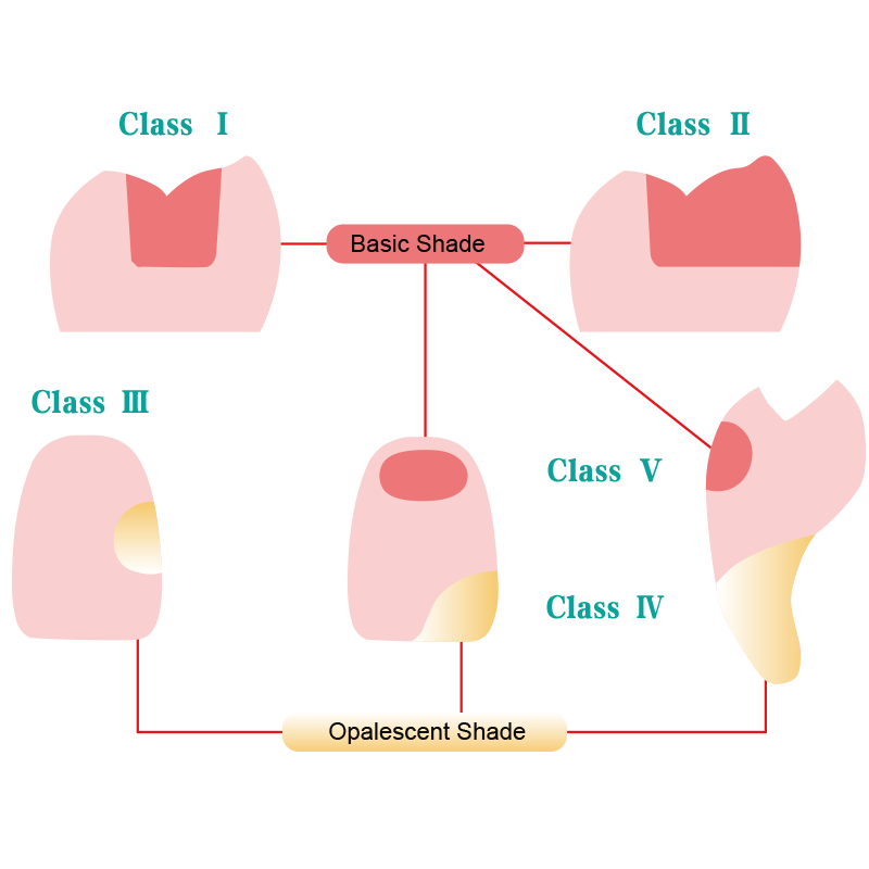 Shades: A1, A2, A3, A3.5, A4, B1, B2, B3, C2, D3, with two dentin-like shades OA2, OA3. YP.Universal shades match the VITA Classical Shade Guide. It’s truly possible to creat natural-looking restorations using a simple way